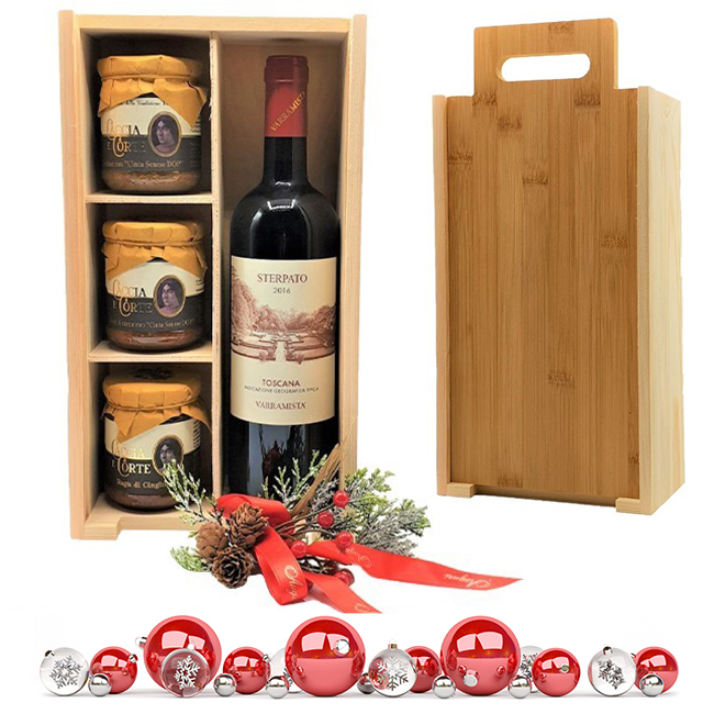 Il box creato per deliziarti con le prelibatezze enogastronomiche toscane, tre meravigliosi sughi di Caccia e Corte e il vino Sterpato IGT della Fattoria Varramista. Tutto racchiuso in una graziosa confezione in legno con tagliere incorporato.