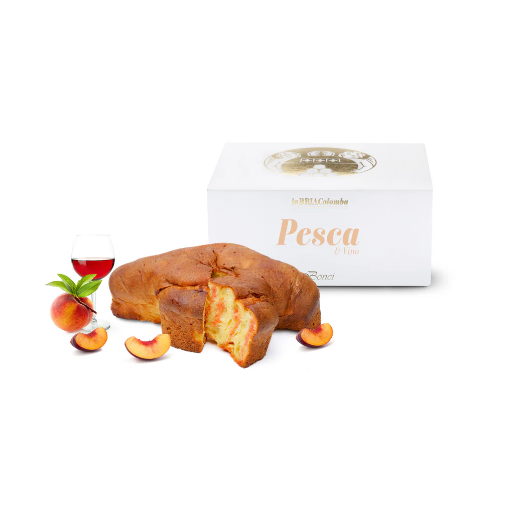 Soft wheat flour, alcoholic syrup (14% vol.) with 30% imbibition (water, sugar, ethyl alcohol, 10% red wine, natural flavours), candied peach 18% (sugar, peaches, glucose syrup from wheat), sugar, butter (milk), pasteurized free-range eggs, natural yeast, salt.