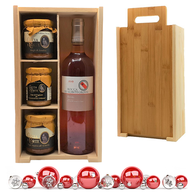 Box created to accompany your holidays with Tuscan delights. All enclosed in a delightful wooden case with a cutting board.