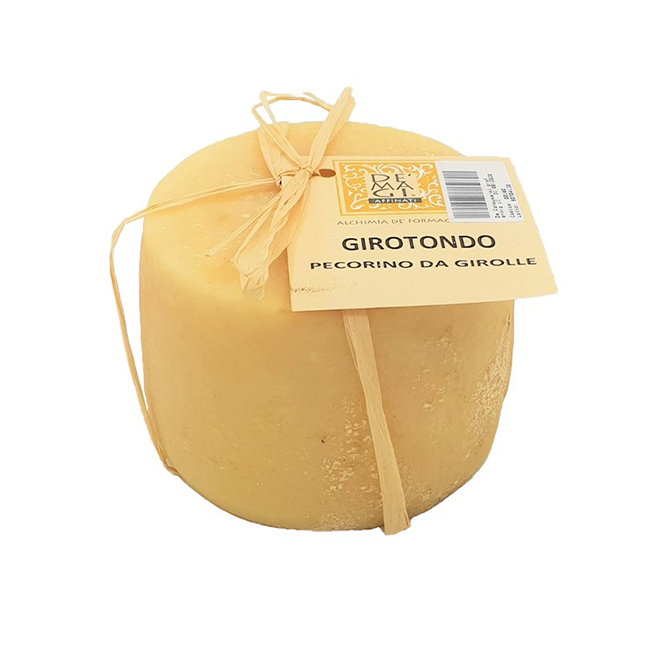 Girotondo is an aged sheep cheese from a cylindrical shape, with a slightly convex heel of about 8 cm in height and almost flat faces of 8-9 cm on the side. The rind is hard straw-colored with darker and irregular spots that vary depending on the seasoning with the possible presence of mold. Compact but crumbly paste. Animal notes (clean sheepskin) and stable, of cooked butter and vegetables such as toasted dried fruit, a hint of undergrowth, and delicately sweet taste.