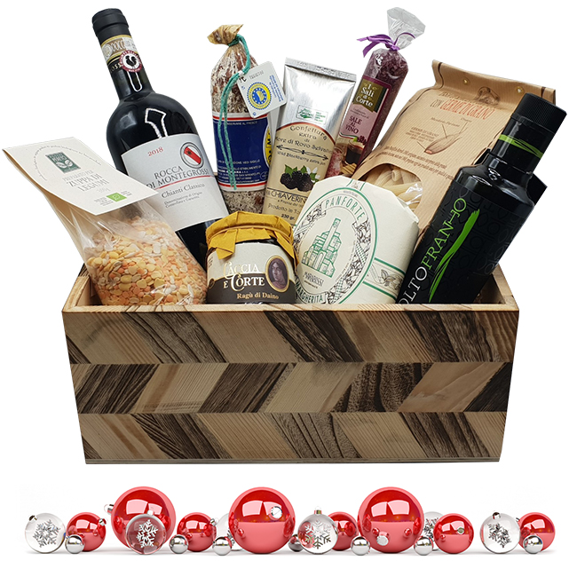Il box creato per accompagnare le tue feste con le prelibatezze enogastronomiche toscane. Tutto racchiuso in una deliziosa confezione in legno con tagliere incorporato.