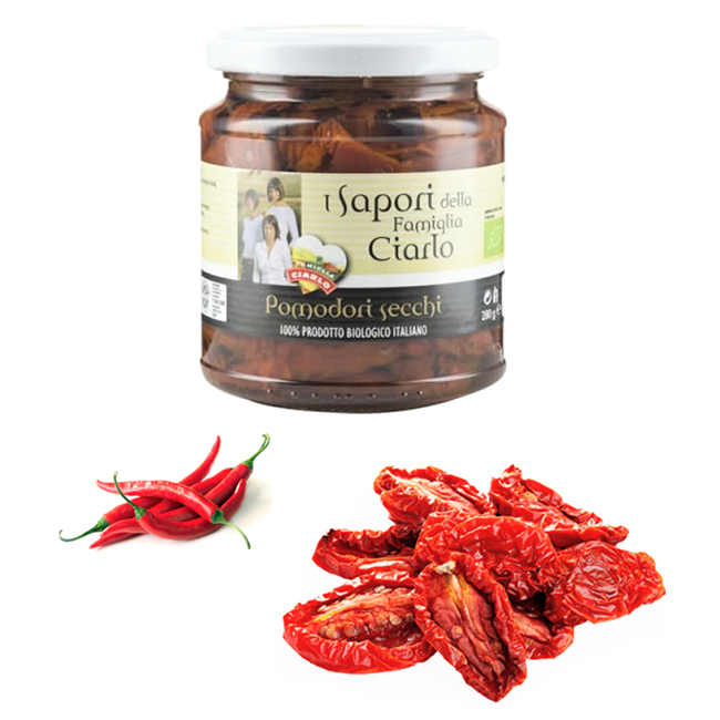 pomodori secchi 63%*, olio extra vergine di oliva*, aceto di vino*, peperoncino* e sale marino.*da agricoltura biologica.