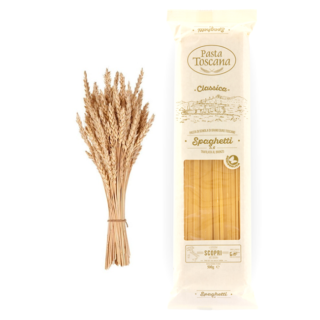Pasta prodotta interamente in Toscana con grano duro di alta qualità. Genuina, tipica, sana. Il marchio Agriqualità garantisce tecniche di produzione e raccolta che rispettano l’ambiente. Trafilata al bronzo ed essiccata lentamente a basse temperature