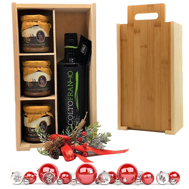 Il box creato per deliziarti con le vere prelibatezze gastronomiche toscane, tre meravigliosi sughi di Caccia e Corte e Olio EVO Cru Coltofranto di Oleificio Morettini. Tutto racchiuso in una confezione in legno con tagliere incorporato.